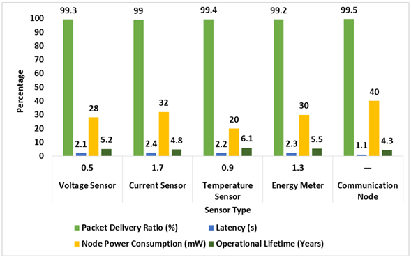 Figure 4 IOT Sensor Performance and Communication Reliability in the Intelligent Energy Monitoring Network The comparison of the metrics of performance of IoT sensors in Figure 4 includes the ratio of packet delivery, the latency, the power used by the node, and the period of its work. The findings reveal that it is highly reliable in communications, low latency, and consumes low energy, which proves that IoT sensors can be effectively used to provide a continuous monitoring system in intelligent power distribution systems. 7. Conclusion The paper develops a theoretical model of a one-wire IoT based smart energy distribution system that can overcome the constraints of the traditional multi-conductor power systems. The proposed architecture incorporates simplified physical infrastructure and advanced sensing, edge computing and cloud-based analytics, which will enable real-time monitoring, adaptive control and better system visualization. Throughout the research, the combination of minimal-conductor transmission with IoT technologies can build a more efficient and affordable alternative distribution architecture to be applied to particular deployment scenarios. Evaluations of the proposed system using simulations show that the system will be 15-25% cheaper in terms of capital costs than traditional three-phase distribution systems, and this is due to the fact that the conductor material needs to be significantly reduced, and the structural infrastructure made relatively simpler. Simplified topology is still acceptable to electrical performance provided that proper compensation and protection methods are applied. The system attains a mean energy transmission efficiency of about 95.8 and the voltage regulation, harmonic distortion and stability parameters meet normal utility criteria. In addition, the built-in IoT network of monitoring gives the network the accurate capacity of measurement, the stable performance of communication, and the system visibility as a tool of operational as well as predictive maintenance. The suggested architecture has a number of benefits such as efficiency in materials, accelerated deployment, improved grid visibility, and environmental friendliness in terms of minimal infrastructure intensity. The features of the system especially render it to rural electrification, microgrids, temporary power plants, and new smart energy networks. Nonetheless, the research is mainly conceptual and based on simulation models, hence, the practical validation with hardware prototyping and field experiments should be carried out.