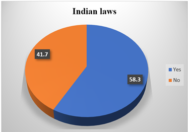 acid attacks, human trafficking etc. against women. It was concluded that 58.3% of respondents agreed that Indian laws have successfully eliminated the crimes such as domestic violence, child marriage, child sexual abuse, rape, sexual harassment, dowry, dowry deaths, acid attacks, human trafficking etc. against women, and 41.7% of respondents disagreed with it. Table 2