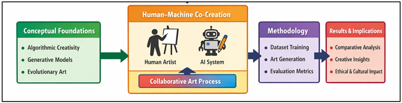 1. INTRODUCTION The blistering development of artificial intelligence and the technologies of computational processes has changed the situation in the field of modern visual art dramatically. Algorithms creativity has become a potent trend in recent years where machines are now able to be involved in the artistic process traditionally controlled by human imagination and intuition. With machine learning, generative algorithms, and computational models, artificial intelligence systems can currently create visually complex art, create new aesthetic patterns, and assist artists in experimenting with new creative possibilities. Consequently, the lines between human creativity and machine generated content are becoming more and more mixed resulting in a new paradigm called human- machine co-creation in visual art Rombach et al. (2022). This type of creativity is usually achieved via algorithms capable of identifying patterns on a large scale and creating the novel visual forms following probabilistic, procedural or evolutionary mechanisms Marcus et al. (2022). Generative adversarial networks (GANs), neural style transfer, evolutionary algorithms, and procedural generation techniques have empowered machines to generate works of art similar or in the style of the conventional arts. They have brought forth new directions in the experiments of art and provided an opportunity to artists to work with algorithms as creative collaborators instead of just applying the digital tools to production Borji (2023). Visual art looked after by humans and machines can be regarded as a kind of co-creation where human artists and computer-like systems have a co-creative role. Artists in such partnerships usually take up the roles of data curators, model trainers, conceptual designers and critics of the generated outputs. Machines, however, offer generative abilities that have the potential to create a wide variety of visual compositions, cover extensive design spaces, and bring about unforeseen aesthetical variations. This interplay creates a hybrid creative space in which artistic conceptualisation among human intuition develops through repetitive interactions between the human intuition and algorithmic exploration Westermann and Gupta (2023). Algorithms creativity has also created debates on the nature of authorship, originality and artistic value. Although machines are capable of producing images on their own, the aesthetic motivation and contexts are usually left to human artists. Co-created art, therefore, does not fit the traditional definition of creativity and also presents questions regarding how the contributions to art are to be assigned to the human in a human-AI system Giannini and Bowen (2023). Figure 1 demonstrates the structure that combines AI algorithms and human creativity to work together. Furthermore, the trend toward the application of AI in the creative industries has provoked discussions on the ethical criteria, cultural reflection, and the impact of automated systems on creative activities. Figure 1
