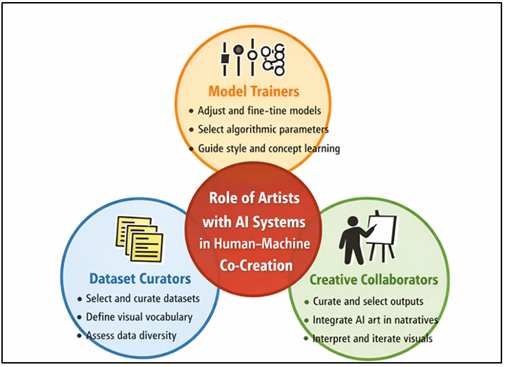 Figure 2 Role of Artists as Curators, Trainers, and Creative Collaborators in Human–AI Co-Created Art Systems Their experience determines the conceptual flow, aesthetic judgment and contextual meaning of the algorithmic generated art pieces. Datasets curation is one of the main functions of artists, as they choose or create training datasets that change the way the generative models are trained to learn visual patterns. Figure 2 represents artists interpreting data, training models, working with AI. As the AI systems are trained on data, the quality, variety, and thematic orientation of the data have a large influence on the artistic products. Artists thus are very instrumental in establishing the visual vocabulary which the algorithm could have. Artists also serve as model trainers, as well as, parameter designers. 4. Methodology for Evaluating Human–Machine Co-Created Artworks 4.1. Experimental design for collaborative art generation The experimental model under consideration of evaluating human-generated artworks with the inclusion of machines is designed in such a way that it allows the systematic analysis of the interaction between algorithmic systems and human artists in the creative process. The paper uses a hybrid experimental design, which combines automated generative models and human artistic intervention. The experiment occurs in two principal phases: the generation of artwork, which is automated, and the process of refining the works, which is done collaboratively. During the first step, a generative artificial intelligence model generates a massive number of visual outputs using a pattern learned during training data. All these are algorithmic creations that were made without any human intervention. This stage is aimed at setting a point of reference in terms of assessing the creative capacity of the algorithmic system. Different algorithmic parameters including learning rate, dimensionality of the latent space and conditioning the style are varied to generate different visual compositions. The second stage involves the interaction among human artists with the created outputs, through picking evolving and refining visual elements. Artists can change color schemes, structure, balance of composition, or style. This co-creation phase is a simulation of real-world processes of human and machine co-creation in which AI is used as a creative helper. 4.2. Dataset Preparation and Training of Generative Models Preparation of data sets is an important step towards creating generative models that can be used to create meaningful visual artworks. The data set of this work is a selected sample of digital paintings, abstract art images, and style visual compositions that were received through publicly available repositories of art and digital art archives. The dataset consists of several visual styles, including abstract expressionism, geometric art, surrealism, and contemporary digital illustrations, so that it would be diverse and have an artistic variety. The data is preprocessed in a number of steps prior to the training of the generative model. The pictures are downsampled to a uniform resolution, made to have uniform pixel values, and divided based on artistic style. Data augmentation methods like rotation, scaling, flipping colors etc. are used to enhance the diversity of data and to ensure that overfitting will not happen during training. These preprocessing steps are useful in enhancing the capacity of the model to acquire irregular visual patterns. The iterative optimization process is employed in the training process wherein the generator is taught to generate images whilst the discriminator is taught to assess their similarity to natural artworks. Through repeated training periods the model progressively acquires the artistic characteristics such as textures, color associations and compositional components. 5. Results and Analysis of Algorithmic Creativity in Visual Art 5.1. Comparative analysis of AI-generated versus human–machine co-created artworks The relative analysis shows observable variations in the works of only AI-generated images and human-machine joint visual images. The images produced by AI are characterized by a very high level of structural complexity and diversity of patterns with a low level of conceptual consistency and contextuality. By comparison, the artworks created by humans in cooperation with machines demonstrate better sense of balance, consistency of theme, and visual attractiveness. According to quantitative evaluation, pieces of art that are created both by humans and AI have a higher average score in aesthetic evaluation (in the range of 88) than AI-created artworks (in the range of 74). Table 2