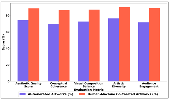 Figure 3 Comparative Analysis of AI-Generated and Human–Machine Co-Created Artworks Across Evaluation Metrics There is also an increase in conceptual coherence as it goes to 69.8 and 86.3 indicating the high influence of artists in the direction of the thematic meaning as well as contextual relevance. Equally, the visual composition balance is enhanced to 87.1, as compared to 72.5 which implies that human intervention assists in better organizing spatial and stylistic aspects. Figure 4