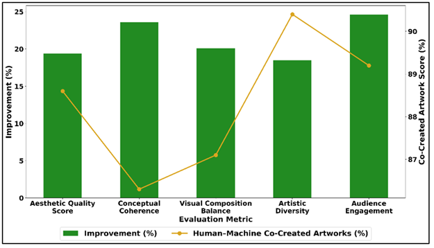 Figure 4 Improvement and Co-Created Performance Trends Across Artistic Evaluation Parameters Figure 4 shows that several parameters of performance were enhanced in relation to artistic evaluation. The artistic diversity rises to 90.4 out of 76.3 which indicates that collaborative processes improve artistic diversity. The greatest increase has been noted in the area of audience engagement, which increases by 24.6, 71.6 to 89.2. 5.2. Influence of Algorithmic Parameters on Artistic Diversity and Style Empirical investigations have shown that set parameters by algorithms can play a major role in the variety and style of generated visual arts. Changes in both dimensions of latent space, noise variance and training epochs have a direct influence on the variability and complexity of artistic results. As the dimensionality of latent space is increased, the degree of stylistic diversity also increases, and the metrics of diversity increase to about 0.62 to 0.81. Likewise, textures and color discoveries in generated images are increased by controlled noise injection. Table 3