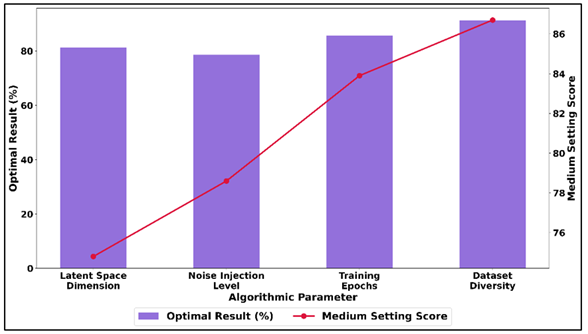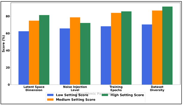 Figure 5 Comparative Analysis of Low, Medium, and High Setting Scores Across Algorithmic Parameters The higher the latent space dimension, the higher the diversity score of 62.4 to 81.3, which proves that the bigger the representation space, the more style options are available to the model. Figure 6 identifies the best parameter combinations that enhance the quality of diversity and the quality of generative artwork. Noise injection performs best at the medium level (78.6%), in which controlled randomness expands the variation of texture and exploration of creativity. Figure 6