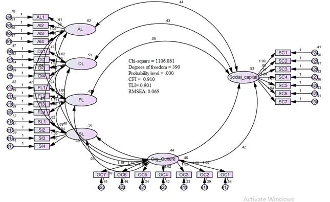 standard deviation of 0.988, indicating a moderate level of agreement. This research intends to validate the main construct namely leadership, social capital, and organizational culture using pooled CFA procedure. The Pooled-CFA technique was selected for its efficiency, comprehensiveness, and lack of model identification difficulties Awang et al. (2015), Awang (2014). All constructions are combined and linked with double-headed arrows in Figure 2 to examine the association between them. The model fit was assessed by comparing the fitness indexes of this structural model to the predefined threshold indexes from the literature, as shown in Table 8. Figure 2