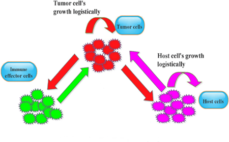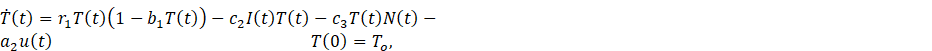 5. Tumor model I indicate the immune cells number at time t, T denotes the tumor cells number at time t, N describes the normal (host) cells number at time t, and u is the plan of control.\begin{figure}[h] \centering \includegraphics[width=.5\linewidth]{T-I-N.eps} \caption{Random tumor and immune cells interactions.}