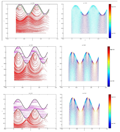 streamlines and velocity field plots for varying hydraulic resistivity It is important to study the magnitude of the velocity fields, given by the colors of the field arrows. Within the circulation regions, the fluid velocity is at its slowest, this is illustrated by the blue color of the velocity field. Fluid or in the case of the human body, material, or nutrients, in this region, circulate at a slow speed or have a greater resident time. This allows for more efficient mixing and absorption of nutrients into the porous region underneath the peaks. Wei et al. (2003) commented that the circulation regions they observed inside the peaks of the poroelastic region allows a greater resident time for fluid particles near the adjacent trough. This is not the case for the core fluid in this model, in fact from the velocity field plots, the troughs adjacent to the circulating peak regions have a higher velocity than the circulating fluid. Geometric effects