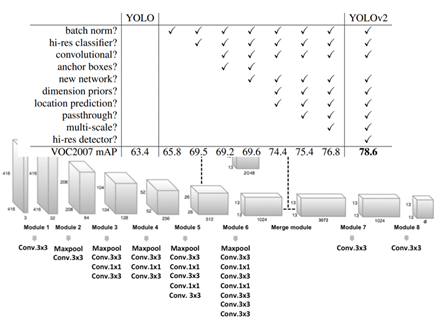 In 2017, YOLO v2 has been proposed [10], and based on v1, three parts of training, grid structure and database have been enhanced [9], the authors proposed the Darknet-19 architecture by removing the fully connected layer from the v1 version and replacing it with a fully domain-averaged pooling layer, which consists of 19 convolutional layers and 5 maximal pooling layers in the whole neural network, and adjusting the input size from 448x448 to 416x416 and increasing the feature size to 13x13, improved the recall rate. As shown in Figure 2, after various enhancements, YOLO v2 was able to achieve 76.8% mAP at 76FPS and 78.6% mAP at 40FPS in the VOC2007 database, which improved the speed. Figure 2