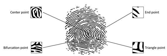 mAP (Mean Average Precision) is a common metric for evaluating models, where AP (Average Precision) is the average precision of a target, and mAP is the average of the APs of all targets in the model. 2.2. Principles of fingerprint recognition Fingerprint recognition technology is a biometric identification technology, which is a set of fingerprint image acquisition, processing, feature extraction and comparison modules of the pattern recognition system. Fingerprints are lines formed by the bumpy skin on the end of the fingers of primates, and these lines are also imprinted on objects. Fingerprints are characterized by details such as starting points, ending points, triangular points, and bifurcation points. Since fingerprints are different for each person, and different fingers of the same person have different fingerprints. Fingerprint identification is done by comparing these detailed features. The human fingerprint contains a large number of messages, called fingerprint features. There are many feature points, which provide separate identification information and are the basis for fingerprint recognition. There are general features, local features, and the general features in the fingerprint as shown in Figure 3. These include the center point (the progressive center of the fingerprint), the triangle point (the point where two or three lines meet), the bifurcation point (the point where one line bifurcates into two lines), and the number of lines (the number of lines in the fingerprint); the local features are the details of the fingerprint, the direction, curvature, and location of the nodes at the feature points, which are important indicators to distinguish different fingerprints. Figure 3