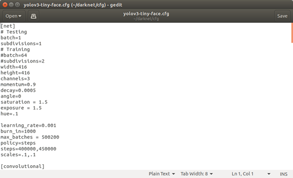 3. RESULTS AND DISCUSSIONS This section introduces the experimental setup, experimental procedures and results. 3.1. Face recognition In this experiment, the face recognition part has been done using deep learning with a large amount of image data needed for training. First, the face images of three people were taken in the experiment for different angles of the face. The total number of the face images is 3000. After finishing the image collection, each image needs to be manually labeled. LabelImg software was used for labeling in this experiment. Then corresponding txt files were generated for each image. There are five values in the file, namely class, x, y, w, and h, where x and y are the center coordinates relative to the image width and height, and w and h are the ratio relative to the image width and height. Finally the cfg files for training were set up as shown in Figure 4. The deep learning controller is used for training, and the detailed specifications for the deep learning controller are shown in Table 2. Figure 4