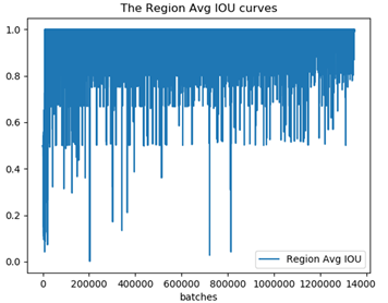 IoU (Intersection over Union) is another index to judge the training of the model, which is to measure the degree of overlap between the predicted position of the model and the actual position of the object. When the degree of overlap is high, the IoU value should be close to 1 as shown in Figure 6. As the number of training times increases, the IoU gets closer to 1 and stays mostly above 0.8 by the end of training. Figure 6