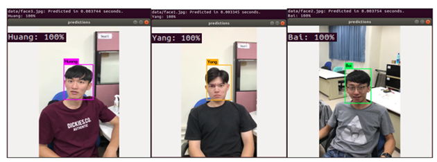 After the training, the deep learning model was used for photo, video, and real-time verification. In the real-time verification, the faces of three people were detected as shown in Figure 7. It can be seen that the three people could be detected with 100% confidence. Figure 7