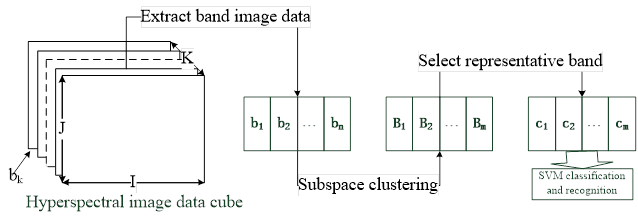 The above method of band selection is carried out in its original space. In fact, high-dimensional data is usually not evenly distributed in its original space, but in its embedded low-dimensional subspace Wei Li, Yan Huang, C.-C (2017), Xiangpo Wei, Xuchu Yu, Bing Liu (2019). For example, face image data under different illumination Zhang J, Li C G, You C (2019), moving tracks of objects in videos Zhao W, Du S. (2016) etc. Therefore, this paper proposes a hyperspectral image classification method based on subspace clustering. Based on the self-expression property of the data, the sparse representation of each band image is obtained through a global sparse optimization process. Based on the sparse representation, the similarity matrix between the band images is established, and the spectral clustering algorithm is used to cluster the band images. Then, a band is selected from each category to form a subset of bands, and the dimension reduction of hyperspectral data is completed. SVM classifier is used to classify and identify ground objects on the dimensionless sample points. The experimental data show that the new method can effectively improve the accuracy of ground object recognition compared with other band selection methods. 2. Hyperspectral image classification process The space-borne hyperspectral imager is able
