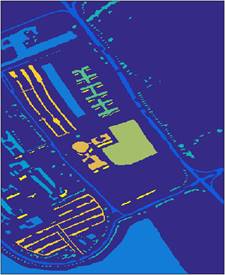 to form the band feature subset Output: Feature set of selected bands 4. RESULTS AND DISCUSSIONS In order to verify the effectiveness of the hyperspectral image classification method (SCBS) based on subspace clustering, experiments were carried out on real hyperspectral data sets. The hyperspectral data set Pavia University was selected. Pavia University data is hyperspectral data taken by the German Reflective Optics Spectrographic Imaging System (ROSIS-03) on the University of Pavia, Italy. The spectral imager can continuously image 115 bands in the wavelength range of 0.43 to 0.86μm, and the spatial resolution of the image is 1.3m. Among them, 12 bands are eliminated due to the influence of noise, so generally the image formed by the remaining 103 spectral bands is used. The size of this data is 610×340, so it contains a total of 207,400 pixels. However, it contains a large number of background pixels and only 42,776 pixels containing ground objects. These pixels contain a total of 9 types of ground objects. These include trees, Asphalt roads, Bricks, Meadows, etc., as shown in Table 1. Figure 2(a) is the pseudo-color image extracted from the three bands (80,60 and 20) and superimposed by the two-dimensional matrix as the three channels of the RGB image, and Figure 2(b) is the real ground object annotation map. There are altogether 9 feature categories, as shown in Table 1.