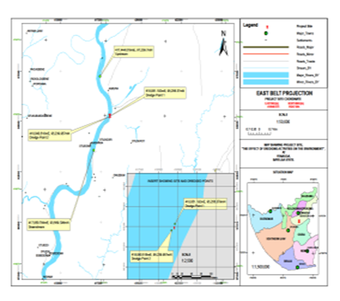 Dredging is an underwater exaction re-channel in order to improve navigation or for commercial functions (Iyama and Edori (2014), Jones (1986)), likewise Iyama (2005), added that it is the removal of bed materials and vegetation from a river channel. The deposition of dredged materials in uniform layers over wet land vegetation or open bay bottom occurred in dredging (Iyama and Edori (2014), Turner and Streever (2002)). According to Nick and Marsha (2010), the basic reasons for dredging are; navigation, reclamation, beach nourishment, environmental remediation, flood control, mining for precious stone. However, the intensity of dredging depends on the purpose, the purpose for the study area that is Ekole Creek, basically commercial that is, to get sand from the river for commercial purpose, which has intensified the rate of dredging to make as much profit as possible so long as they are not checked, thereby reducing the environment to the position of an undeserved victim. The operations have created tremendous adverse effect on both the downstream users as well as host communities in terms of ecosystem safety and biota disturbance through heavy metals re-suspension. Depending upon the nature of the dredged material, its disturbance from the sea bed may lead to changes in the Physical and the chemical composition of the water (Seiyaboh et al. (2013)) Since the physical and chemical qualities of the downstream water is affected by dredging, there is need to the determine the physicochemical properties of the downstream of Ekole river where dredging activities is heavy and may cause some adverse effects on downstream users because it concerns re-suspension of bottom sediments where there may be contaminants that may possibly pollute the water column. Therefore, the water quality may have effect on both the aquatic life and the surrounding ecosystem. it must then, be determined through physical properties which includes temperature and turbidity and chemical characteristic which includes pH and dissolved oxygen Fondriest Environmental Leaning Centre, Water Quality (2021) (www.fondriest.com, 2021). Narayanan (2009), also ascertained that the chemical parameters for determination of water quality are solutes, salinity and hardness, pH, Dissolved Oxygen (DO), Boichemical Oxygen Demand (BOD) and Chemical Oxygen Demand (COD), but this study will deal with pH, DO, Total Suspended Solids (TSS) and Total Dissolve Solid (TDS) and heavy metals. Ekole Creek, Nun River in Yenagoa Local Government Area of Bayelsa State, stems from River Niger in Nigeria. some of the communities that depend on it within two kilometers distance upstream and downstream are; Famgbe, Obogoro, Yenagoa, Akaba, Swali, Ogu, Agbura, Otuokpoti, Onuebum, Otuedu and Otuogori. It is located between latitudes 4°49’N and 5°23'N and also within longitudes 6°10' E and 6°33'E (Koinyan et al. 2013). This work is to determine quality of water through the observation of levels of physicochemical parameters during dredging activities and its effects on downstream. 2. MATERIALS AND METHODS 2.1. The Study Area The study area is Yenagoa Local Government Area (LGA) in Bayelsa State of Nigeria as seen in Figure 1. Yenagoa LGA is geographically located within latitudes 4°49’N and 5°23'N and also within longitudes 6°10' E and 6°33'E (Koinyan et al. 2013). Yenagoa City is the capital of Bayelsa State and Yenagoa LGA dense population in the State. Other communities like Agbura, Ekolo, Otuokpoti, Ikasikara, Otuegwe ,Otuogori etc within the study area.