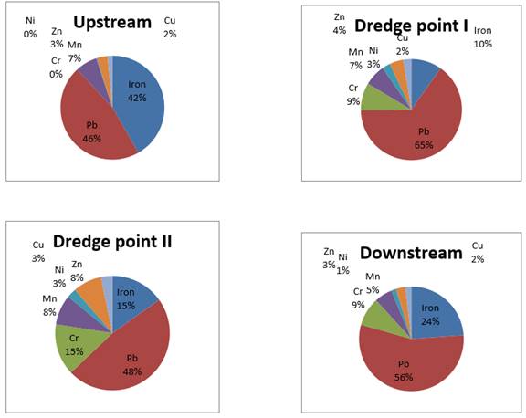 The result indicates that the water at the Downstream is slightly acidic, it is high in Turbidity and TDS, and but low in TDS, EC, NO3 and DO as compare to the Upstream. This shows the effect of dredging on the water quality of the Ekole Creek. At about 2 km downstream of the dredged points, the creek’s self-purification was not complete because the water quality could not get back to its upstream value before dredging. The acidity of water in downstream can be traced to re-introduction of minerals from bottom sediments as a result of dredging activities; this is in agreement with Warren (1981) who asserts that acid is formed when chemicals in the bottom sediments combine with the water in the creek. The low level of DO at downstream is due to re-suspension of sediments that have used up part of the DO. Nitrates and Phosphates were generally low, because the agricultural sources waste and sewage disposal did not influence the concentrations of Nitrate and Phosphate at downstream, since dredging causes dilution of solute in creek as agreed by Garg (2010). Both Fe and Pb exceeded their maximum allowable limits at the downstream point of the creek for potable water, the accumulation of which may lead to metal poisoning which hazardous to the health of downstream user. The increase indicates; river traffic density, leaded petrol was used in the environment which gets into the water, atmosphere, trapped on leaves at the banks of the creek or even directly released into water column (Odukoya et al. (2002)). The presence of river transportation in the study area (Ekole creek) gave rise to many floating petrol filling stations, boat ducks and workshops, dumping of waste, agricultural activities at the banks of the river, fishing and sand dredging activities that are responsible for the re-suspension of pollutants absorbed or adsorbed in bottom sediments. These may have contributed to the high levels of some specific parameters (Turbidity, TSS, TDS, EC, Nitrate, Phosphate, Fe, Pb, Cr, Mn, Ni, Zn and Cu). 3.2. CORRELATIVE MATRIX OF PHYSICO-CHEMICAL PARAMETERS OF WATER QUALITY In Table 3, comparative analysis of physicochemical parameters can be drawn; the general results of correlation water quality at sample collection points varied. An increased pH number in the water samples, causes a decrease in the concentrations of heavy metals, the increase in pH of the sediments resulted in increased levels of heavy metals at the four sampling stations. The relative abundance of the metals in the water at the various sampling points showed the following pattern: Upstream (Pb>Fe>Mn>Zn>Cu>Ni>Cr); Dredge point I (Pb>Fe>Cr>Mn>Zn>Ni>Cu); Dredge point II (Pb>Fe>Cr>Mn>Zn>Cu>Ni); Downstream (Pb>Fe>Cr>Mn>Zn>Cu>Ni). The pictorial representation is seen in Figure 3. Pb concentrations were obviously high and most abundant of all the heavy metals at all sampling locations. It is possible that much of Pb containing materials (e.g petroleum products) are released into the creek. This includes petroleum products from transportation activities and floating petrol filling stations that have contributed it in the study area.