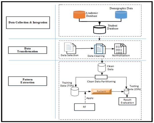 2. MATERIALS AND METHODS This study focused is to build an efficient predictive model for final WASSCE score of SHS students’ using random forest algorithm based on their Demographic Data and Past Exams records. The methods, procedures and techniques adopted are organized into the following sections study design, area of the study, the population of the study, sample and sampling technique, instruments for data collection, the validity of the instruments, reliability of the instruments, method of data collection/instrument, and method of data presentation/analysis. 3. PROPOSED CONCEPTUAL FRAMEWORK The framework for predicting the academic performance of students’ using the RF algorithm, as shown in Figure 1. The framework illustrates the steps involved in developing models to predict final exams score for SHS final year students. There are three main phases involved in this research which are data-collection, data-integration, data-transformation, and pattern extraction. To apply DM algorithms on any data, it is essential to carry out some data pre-processing tasks such as data-cleaning, integration, discretization, and data-transformation Berhanu (2015). Data Collection and Integration: 1520 participants from records of student’s offering Business, General Art, Visual Art, Home Economics, and Science, which consisted of both demographic and past academic performance were integrated into one file using SQL database server at this stage as shown in Figure 1. Data Transformation: At this stage, the integrated data was passed through three distinct stages, (i) data cleaning which includes filling in missing values, smoothing noise, identification, and removing of outliers where necessary and resolving data inconsistency. (ii) Data normalization and aggregation (iii) data reduction, where volumes of data were reduced but produce the same or similar analytical results using feature selection and feature extraction. All data transformation process was carried out with Python. Patterns Extraction: Weka, an open-source data mining program, was used to construct the predictive model using the RF regressor. Data Partitioning: 1500 out of the 1520 clean data was partitioned into two, thus training dataset (Train_D) which accounted for 75% of the dataset (DS) and the remaining 25% was apportioned for testing (Test_D) the proposed model as shown in figure 3.2. The reaming 20 records were the records of students who are still in school (SHS 3) preparing to write their final WASSCE.
