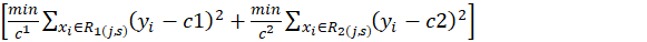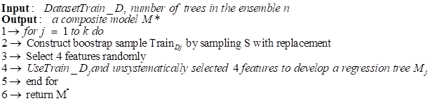 Choosing Variables to Split On: grow unpruned regression tree using the steps for each of the bootstrap samples: At the individual node, indiscriminately sample K variables and select the most exceptional split among those variables (K) rather than picking the most excellent split amid all predictors. This practice is sometimes called “feature bagging.” We select a random subset of the predictors or features because the correlation of the trees in a standard bootstrap sample can be reduced. In this study K=p⁄3. The splitting principle, let assume that a partition is divided into T constituencies R1, R2…, RT. We model the response as a constant ck in each constituency as proposed by Wu et al. (2017) in equation Equation 3. The splitting principle at each node is to minimize the sum of squares. Hence, the best c ̂t_tis the average of yi in region Rt as given in equation Equation 4. (c_t) ̂=ave (y_i│x_i∈R_t) Equation 4 Let a splitting feature j and split point s, and express the pair of half-planes