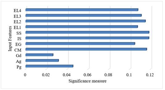 4.3. FEATURE IMPORTANCE RANKING The correlation between each input feature and the expected output (WASSCE score) was tested. Figure 2 shows the feature's importance ranking. The result shows that the demographic data (age and gender) are of less significance. Thus, the gender and age of a candidate do not determine how good or bad he/she will pass the final WASSCE. Again, the program pursued by a candidate also is of less importance to one passing the WASSCE. However, students’ performance in Integrated Science (IS) and Social Studies (SS) were seen to be the most significant determining factor of one passing his/her WASSCE. Furthermore, the results show that the average continuous assessment score of Core Math (CM) by a candidate was also highly related to the candidate success in the final WASSCE. This affirms the reason behind core math being one of the compulsory subjects in all areas of studies.