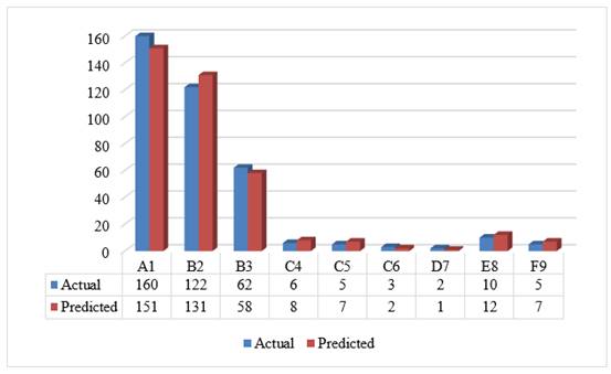 Figure 4 shows the grade analysis based on model prediction against actuals on the test dataset. It was observed that a good number of the students records at least A1 in one or more of the subject grades for the final WASSCE. Also, the closeness of the model predicted to the actual grade confirms the accuracy of the proposed model (see Table 5 and 4.7). Based, on the outcome it can be inferred that a good predictive model can help school authority to ascertain the grade analysis of their students before the WAASCE exams.
