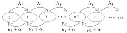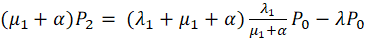 3. NUMERICAL RESULTS The obtained results are evaluated numerically and are based on some specific parameters. The effect of parameters in the various performance measurements are studied and also summarized in the tables given below. Table 1 shows effect of λ, Table 2 shows effect of µ, Table 3 shows effect of α, Table 4 shows effect of µ1 and Table 5 shows effect of λ1 on system performance measures. The model parameters taken in all computations are: λ = 0.6, µ = 0.9,