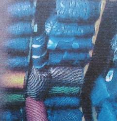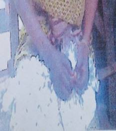 Processes The fabric to be dyed must be clean of dirt’s and sizes. Make sure all sizing (starching) are removed by washing vigorously with soap and hot water. Then, plan your design by dying cloth in any combination. Mix dye thoroughly as indicated by the manufacturer (package/instruction) thereafter, dip material in warm water before dyeing. This will tighten the tied string and also conforms to the dyeing instructions on the dye box. Squeeze out excess water. Place/dip fabric in dye solution (aró) and stir constantly with stick or hand (use rubber gloves – ìbọ̀wọ́ onírọ́bà) so that the material will be dyed evenly. Leave the material in dye for only a few minutes or as you desire (may be longer) but not unnecessarily longer, so the dye will not penetrate the tied areas. You can now remove the fabric from dye and rinse in cold water (you may store away the dye for immediate use). If another colour is to be used, untie the strings desired re-die fabric other spots and put in next colour dye solution. Start with the lightest colour and end with the darkest e.g. yellow should come before blue, orange before purple and so on. Finally you can allow it to drip dry or squeeze out excess water and press dyed fabric with hot iron when it still damp which will also help set the colours.