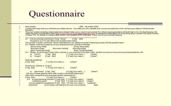 The aim in 2004 was to find the “sufficient statistic”. Simple Random Sampling Scheaffer (2007) was performed from 2004 to 2009. Out of every 100 questionnaires that were sent out every week, 15 to 20 copies returned. The parameters were “fever”, “cough”, “difficulty breathing”, “pneumonia”, “contact with ILI”, “bacterial infections”, and “hospitals”. We used Proc Freq and Proc Genmod in 2004 and we switched to Proc Glimmix in 2007. Proc Freq and Proc Genmod suggested that the parameters “pneumonia” and “contact with ILI” to be likely candidates to be the “sufficient statistic”. Proc Glimmix confirmed that these two parameters showed remarkable convergence on iterative computations. Kay (2014).