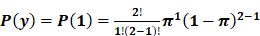 The probability of success y=1 with n=2 trials, for cell row 1 and column 2