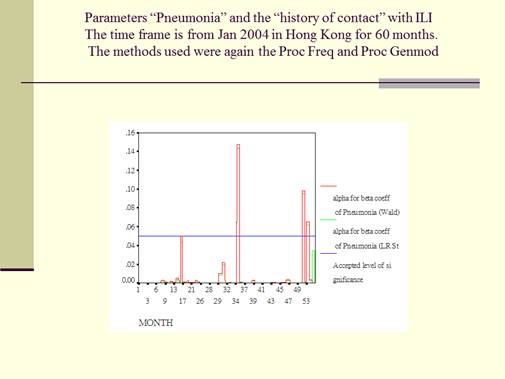 This is the Graph for Parameters “Pneumonia”. The graph for the history of “contact” with ILI is not showed as it had a much more reduced range of “ɑ<0.05 significance” for the “ß coefficients”. The time frame for both is from January 2004 in Hong Kong for a period of 60 months. The methods that were used were the Proc Freq and Proc Genmod. This graph monitored the “ɑ<0.05 significance” of the “ß coefficients” for the categorical counts of the parameter “pneumonia”, reporting Wald and LR statistics as described for the method. The blue line is for the accepted significance level of ɑ<0.05. Red is for the Wald stat and green is for the LR stat. It is clear that from this graph that, with either the Wald or the LR statics, during most of the 60 months during the survey, the significance level of the ß coefficients reached the accepted level of ɑ<0.05. This meant that most of the parameters of “pneumonia” obtained during the survey were significant for computation in the ordinary mathematical sense. It is important to note that, while most of the “pneumonia” parameters were significant enough to reach the ɑ<0.05 significance level, there were three months out of a total of 60 months, where the ɑ significance level did break over to above and beyond the accepted ɑ<0.05 significant level.