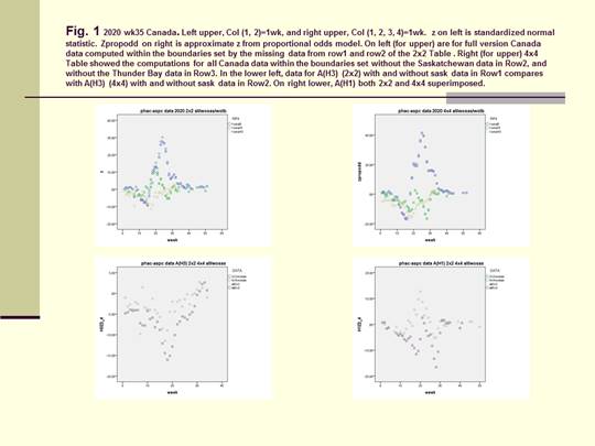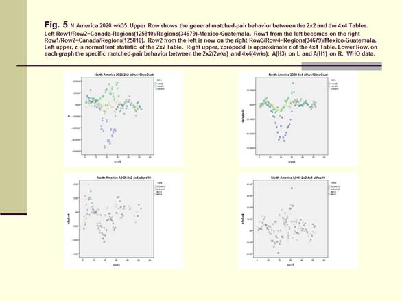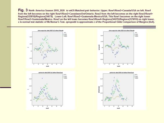 In Figure 3 we computed the full data from Canada, USA, as Row1/Row2=North/South =Canada/USA =BC-Atlantic/Regions (1-10) and the full data from Mexico, Guatemala and USA as Row1/Row2= South/North=Mexico-Guatemala/USA. For Canada/USA we computed these to be within the boundaries formed with Row1=BC-Atlantic Provinces without the Thunder Bay data and with Row2=Regions (1-9) without region 10. On the right upper graph, the data were Row1/Row2/Row3/Row4=CanadawoOnt/Ontario/Region (125810)/Region (34679). Incomparing the 2x2 Table with the 4x4 Table it was found that the original boundary between Row1/Row2 should be kept intact as the boundary between Row2/Row3. For the Same reason, the 2x2 Table for Mexcio-Guatemala/USA was compared with Row1/Row2/Row3/Row4=Guatemala/Mexico/Regions (34679)/Regions (125810).