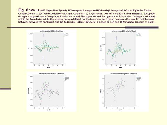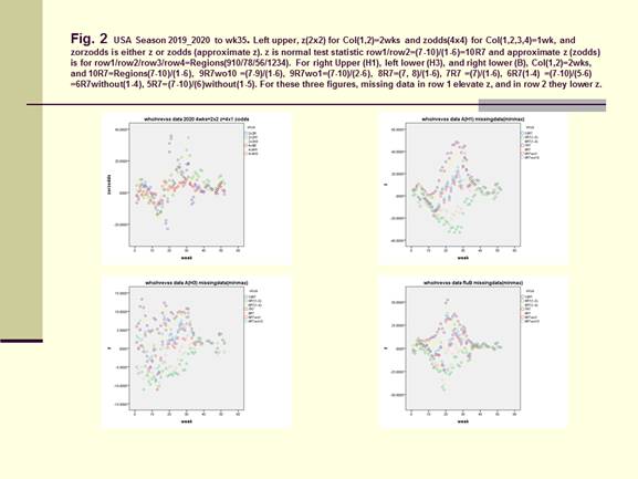 For Figure 2, the left upper diagram showed the full version of the official data (2x24wks) Row1/Row2= (7-10)/ (1-6) =10R7 and (4x4 4wks) Row1/Row2/Row3/Row4 =Regions (910/78/56/1-4). The right upper (AH1), left lower (AH3) and right lower (B) diagrams showed the effects of the missing data (min and max) from both sides of Row1 or Row2 in the 2x2 Table Column (1, 2) =2 wks. The three center-most curves in each of these three diagrams were represented by 10R7=Row1/Row2= (7-10)/ (1-6), 9R7 without 10=Row1/Row2 = (7-9)/ (1-6) and 9R7 without 1=Row1/Row2= (7-10)/ (2-6). The upper boundaries were represented by 8R7=Row1/Row2= (7-8)/ (1-6) and 7R7=Row1/Row2= (7)/ (1-6. And the lower boundaries were by 6R7= (7-10)/ (5-6) without regions (1-4) and 5R7= (7-10)/ (6) without regions (1-5). With these missing data defined for Row1 the entire curves for 8R7=Row1/Row2= (7-8)/ (1-6) and for 7R7=Row1/Row2= (7)/ (1-6) moved upwards along the y-axis. The opposite occurred for Row1/Row2=6R7= (7-10)/ (5-6) without regions (1-4) and for Row1/Row2=5R7= (7-10)/ (6) without regions (1-5). These moved downwards along the y-axis.