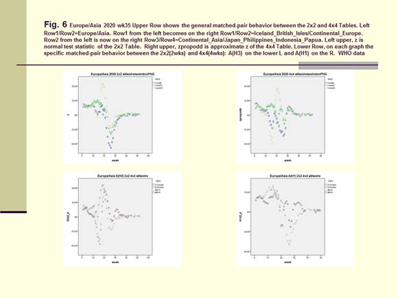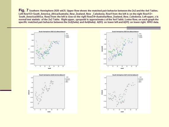 On Figure 1 for Canada, Figure 4 and Figure 8 for the US, Figure 5 for North America, Figure 6 for Europe/Asia, and Figure 7 for the Southern Hemisphere, we tested the matched-pair model generally with the standardized normal test statistic z of the McNemar’s Test on the upper left and compared this with the approximate z based on the Proportional Odds Model on the upper right. On the lower row within each graph, we superimposed the 2x2 (2wk) and 4x4 (4wks) Tables to compare for A(H3) on the lower left and A(H1) on the lower right.