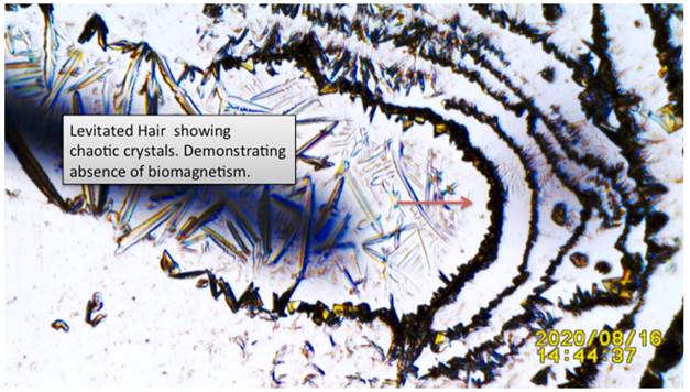 Figure 5 Another Example from Another Hair Showing Different Crystallization Patterns When Hair Is Not in Touch with Slide (Levitating). Red Arrow: Showing Expected Concentric K3Fe Crystals Caused by Emfs from Hair |