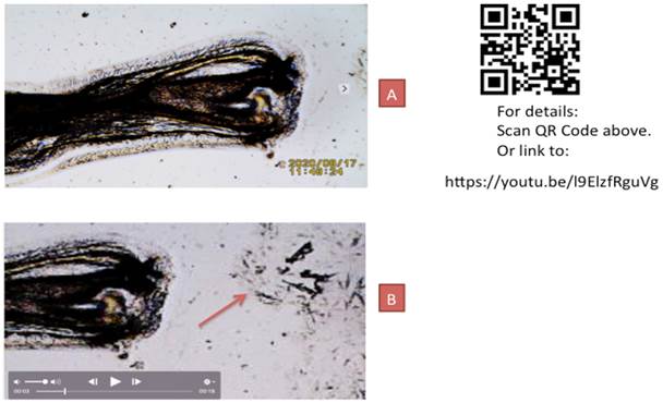 Liquid K3Fe. A: Image of Dead Hair. B: Red Arrow- Same hair Immersed in K3Fe Unable