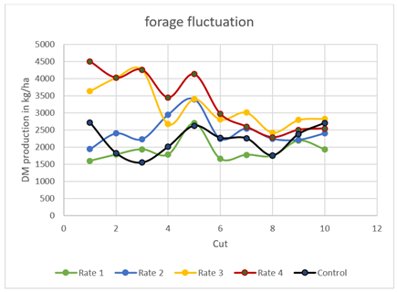 Figure 1 shows a decrease in forage production over time, but this decrease was uneven from one section to the next for all 4 doses and the control. Rate 4 gave the best forage yield at the first cut with an average of 4496.05 kg DM/ha while rate 2 gave the lowest forage yield with 2704 kg DM/ha at the same cut. Of the 10 cuts carried out, rate 1 was the one with the lowest forage yields over the entire production cycle, with yields of 1488 and 1549 kg DM/ha respectively in the 2nd and 3rd cuts. On the other hand, dose 4 is the one that has experienced the greatest drop. Its production has increased from 4496.05 kg DM/ha at the first cut to 2672 kg DM/ha at the 4th cut. Rate 2 had the lowest forage yield at the first cut and increased its forage production to peak at the 5th cut when it produced 3394.80 kg DM/ha. At the last cut of forage production, all rates had lower yields than the first cut except for rate 1 where the yield which was 2704 kg DM/ha at the first cut increased to 2928 kg DM/ha at the last cut.