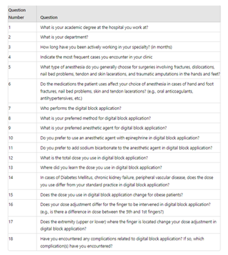 Purpose: The purpose of this study was to investigate the digital block application methods of specialists and assistants working in the Departments of Orthopedics and Traumatology, Emergency Medicine, Anesthesia and Reanimation, and Plastic and Reconstructive Surgery in Turkey and the accuracy of the information on which these methods are based, through a survey, and to interpret the survey results. Study plan: In the survey consisting of a total of eighteen questions, the personal information of the physicians, their preferred digital block application methods, local anesthetic agent selection and application doses, and the source of the information on which these preferences are based were questioned in a digital environment. The responses were interpreted and analyzed. Findings: A total of 110 physicians, 16 specialists and 94 assistants, participated in our survey. In the responses given to the multiple-choice question asked to the participants about the cases you encounter most frequently in your clinic, we saw that the most common ones were fractures at the finger and toe level, skin and subcutaneous lacerations at the finger level, and tendon injuries. In the responses we received to the question of the most preferred type of anesthesia in such injuries, we saw that 51.9% preferred digital block and 42.6% preferred regional anesthesia. In the responses we received to other questions regarding the application method, dosage and different usage patterns in our survey, it was seen that traditional and personal experiences were effective in digital block applications. Conclusion: It was determined that the digital nerve block applications