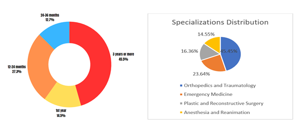 A total of 110 physicians, 16 specialists and 94 residents with academic degrees, participated in our survey. As for the branch distribution, there were 50 doctors from orthopedics and traumatology, 26 emergency medicine, 18 plastic and reconstructive surgery, and 16 anesthesia and reanimation departments.45.5% of the participants consisted of doctors who had worked in the profession for 3 years or more, while the number of people in their first year in the profession was 14.5% of the total number (Graph 1). In the answers given to the question of the most common cases in your multiple-choice clinic asked to the participants, we found that the most common fractures at the level of the fingers and toes, skin-subcutaneous incisions at the level of the fingers and tendon injuries. Again, we have seen that amputation from finger level and nail bed problems are encountered more rarely in clinics. We have seen that 51.9% digital block and 42.6% regional anesthesia were chosen in the answers we received to which anesthesia type is preferred by you, preferably for surgery in cases of fracture-dislocation, nail bed problems, tendon-skin cuts and traumatic amputation in the hand and foot. Although there was no choice of Bier-block anesthesia, 5.6% of the participants made the choice of general anesthesia primarily. It was observed that the drugs used by the patients were effective on the choice of anesthesia at a rate of 57.4% in case of finger and toe fractures, nail bed problems, skin and tendon cuts, and 42.6% thought that they did not affect the choice of anesthesia.