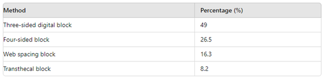 According to the results of the surveys we conducted in the clinics, it was observed that the application, which was performed by a senior assistant and a specialist, was generally preferred by experienced people (79.7%). We see that the majority of the participants use the traditional three-sided digital block application (49%) as the digital block application method and most frequently prefer prilocaine (61.1%) as the anesthetic agent. Among the application methods, 4-sided block applications (26.5%) and web spacing block (16.3%) were seen as other methods frequently preferred by the participants. Transthecal block is a method preferred by very few (8.2%) of the participants. Table 3