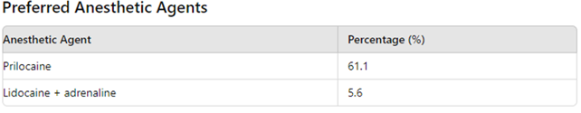 Prilocaine is the most preferred local anesthetic as an anesthetic agent, and the number of participants (5.6%) who used lidocaine + adrenaline as the first choice was found to be low. Table 4