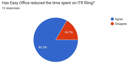 Time efficiency remains one of the strongest outcomes: Automation features like pre-filled data, bulk import utilities, and instant PAN validation and error-checking reduce repetitive manual work. Consequently, returns are processed faster, and staff can manage high volumes of work without sacrificing quality. Survey charts indicate that the majority of participants largely agree that Easy Office contributes to reducing turnaround time.