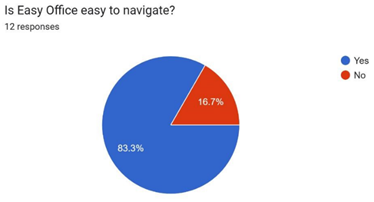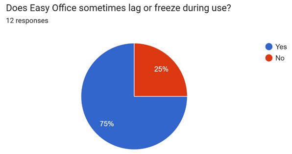 The overall feedback on Easy Office was good; however, survey data reveals that out of the total users using it, about 67% were satisfied whereas almost 33% were not. According to them, the main problem is that at times of heavy workload, Easy Office hangs, freezes, or takes too long to load, which causes delays and disrupts the smooth running of work.