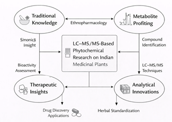 Indian medicinal plants constitute a rich source of structurally diverse bioactive metabolites with significant therapeutic relevance. Advances in analytical technologies, particularly liquid chromatography–tandem mass spectrometry (LC–MS/MS), have greatly enhanced the identification and characterization of complex phytochemical profiles. This review critically summarizes published literature on LC–MS/MS-based phytochemical investigations of Indian medicinal plants, focusing on the identification of major classes of secondary metabolites, including flavonoids, alkaloids, phenolic acids, terpenoids, glycosides, and saponins. Evidence from multiple studies demonstrates that LC–MS/MS enables high-resolution metabolite annotation and provides molecular-level insights that support traditional medicinal applications. The review highlights the role of metabolomics-driven approaches in linking ethnopharmacological knowledge with chemical evidence and discusses their significance in drug discovery, quality control, and standardization of herbal formulations. Keywords: Indian Medicinal Plants, Phytochemical