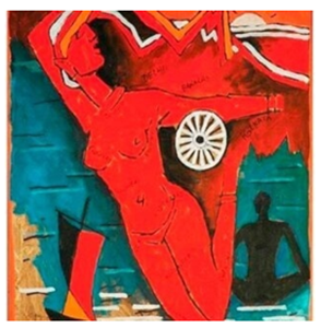 acrylic painting depicting Mother India as a nude figure, surrounded by symbols