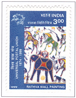 English: This art reflects the civilization, culture, and spiritual beliefs of the Bhils and the Bhil tribe. This art is primarily created by the local residents of Gujarat and Madhya Pradesh. It is not a painting, but the last remaining vestige of a bygone era. It continues to breathe its last through its lines, colors, shapes, and various mediums. This art is a trace of a bygone era that flourished in the lap of nature centuries ago. Rathwa murals are a vibrant, sacred, and historic art. Which depicts the life, spirituality and cultural heritage of the Rathwa tribe on the wall. This art was depicted in the form of memories of their ancestors and cosmic symbols. To highlight the importance and uniqueness of this art, the Indian Postal Department released a commemorative postage stamp on it in 1999. My research highlights the significance of Rathwa art and its cultural, economic, political, and environmental aspects. This paper explores the interrelationship between tribal art and the National Philatelic Collection in India, which honors Rathwa mural painting, the traditional art of the Rathwa tribal community of Gujarat. This study contextualizes the cultural significance of the art (locally known as Pithora), analyzes the origins of the stamp in the context of India Post's broader thematic issues on tribal arts and crafts, and discusses the implications for cultural preservation and heritage recognition. Hindi: यह