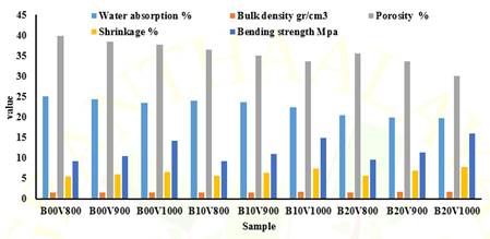 bulk density, shrinkage, and bending strength values. The sintering temperature