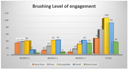 The data provided demonstrates a significant progression in the engagement levels of children with special needs as they learned brushing skills through the use of animation videos. The analysis spans three months, with engagement levels categorized into Very poor, poor, Acceptable, Good, and Very Good. Very Poor Engagement: In Month 1, Very poor engagement was recorded at 33 counts, accounting for 27.5% of the observations. This number significantly decreased to 10 counts (8.3%) in Month 2 and further declined to just 4 counts (3.3%) in Month 3. This steep reduction indicates that the children were moving away from the very poor level of engagement, suggesting that the animation videos were successfully capturing their attention and promoting active participation. Poor Engagement: The Poor level of engagement started at 37 counts (30.8%) in Month 1. This increased to 23 counts (19.2%) in Month 2, before stabilizing back at 14 counts (11.7%) in Month 3. The initial increase and subsequent stabilization suggest that while more children were partially engaged in the middle of the intervention period, this level of engagement was maintained as they progressed to higher levels of engagement. Acceptable Engagement: Acceptable level of engagement showed a consistent upward trend. It began at 39 counts (32.5%) in Month 1, rose to 41 counts (34.2%) in Month 2, and further increased to 29 counts (24.2%) in Month 3. This progression highlights the increasing effectiveness of the animation videos in fostering a deeper level of engagement among the children. Good Engagement: Good engagement levels were initially 11 counts, (9.2%). in Month 1, However, there was a notable rise to 42 counts (35.0%) in Month 2, which further retained to 41 counts (34.2%) in Month 3. This significant increase underscores the effectiveness of the animation videos in driving higher levels of engagement and active participation. Very Good Engagement: Very good level of engagement also showed an encouraging trend. Starting from 0 counts (0.0%) in Month 1, it increased to 4 count (3.3%) in Month 2, and then to 32 counts (26.7%) in Month 3. Although still relatively low, the presence of Full Independent engagement by Month 3 demonstrates the potential of the intervention to foster independence in brushing skills over time. Figure 1