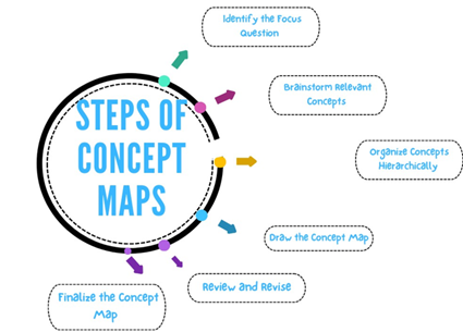 3. Steps in Creating Concept Maps Step 1: Identify the Focus Question The first step in creating a concept map is to define a clear focus question or topic. This question should encapsulate the main idea that the concept map will address. For example, if the topic is "Photosynthesis," the focus question could be, "What are the key processes and components involved in photosynthesis?" Step 2: Brainstorm Relevant Concepts Once the focus question is established, brainstorm a list of relevant concepts related to the topic. This can be done individually or in a group setting. Encourage participants to think broadly and include all possible ideas. For instance, in the case of photosynthesis, concepts might include "chlorophyll," "light energy," "carbon dioxide," and "glucose." Step 3: Organize Concepts Hierarchically After brainstorming, organize the concepts into a hierarchical structure. Place the most general concepts at the top and more specific concepts below. This hierarchy helps to clarify the relationships between concepts. For example, "Photosynthesis" would be at the top, followed by "Light Reactions" and "Calvin Cycle" as sub-concepts. Step 4: Draw the Concept Map Using a software tool or pen and paper, begin to draw the concept map. Start with the main concept at the top and branch out to sub-concepts. Use lines to connect related concepts and label these lines with linking words or phrases that describe the relationship (e.g., "leads to," "requires," "produces"). Step 5: Review and Revise After the initial draft of the concept map is complete, review it for clarity and accuracy. Check for any missing concepts or relationships and revise as necessary. It can be helpful to seek feedback from peers or instructors to ensure the map effectively communicates the intended information. Step 6: Finalize the Concept Map Once revisions are made, finalize the concept map. Ensure that it is visually appealing and easy to read. Consider using colors, shapes, and different line styles to enhance clarity and engagement. Figure 2