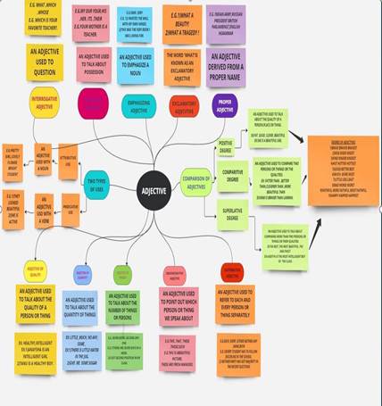 Mind Edraw Mind is a dedicated mind mapping software that provides a comprehensive set of features for creating detailed concept maps. It offers a wide range of templates and symbols, allowing users to create complex diagrams with ease (Edraw, 2023). One of the standout features of Edraw Mind is its ability to export maps in various formats, including PDF, Word, and PowerPoint, making it suitable for academic and professional presentations (Edraw, 2023). The software also supports cloud storage, enabling users to access their work from different devices. Research by Buzan (2006) highlights the effectiveness of mind mapping tools like Edraw Mind in enhancing memory retention and understanding by visually organizing information. The following concept map on adjective has been constructed by using one of the software mentioned above. Many such concept maps can be constructed as per requirement and can make the complex matter simple. Figure 3