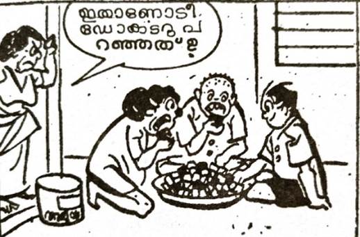 “Cooking”, according to Arjun Appadurai, “is the domain of the women and therefore indicates their general subordination to the men” (497). Appadurai (1981) He continues that “this is a generalized extension of the basic idea that cooking and sexual intercourse are appropriate and symbolically interconnected services performed by a wife for a husband” (497-498). Appadurai (1981) Apparently in cartoons, regardless of the financial or social status of the household, the image of kitchen gets complete only with the presence of women in it. In middle class and lower-class households, the women homemakers carry out the chores in the kitchen, while in upper class families, housemaids are hired to do the same. In any case, the chores in the kitchen are deemed feminine. In contrast, men are shown to be seated cosily on a sofa, reading the newspaper with a cup of tea. In “Bobanum Moliyum”, Toms always places the mother in the kitchen. Every frame portraying any action occurring in the background of the kitchen has the perennial presence of the mother. All the domestic chores in the kitchen and the house are assumed to be the responsibility of women and this is evident in the character of the girl, Moli. The cartoons present Moli as equal to Boban in every respect except cooking, for which only she is summoned to help the mother. For instance, Moli, instead of Boban, is made to serve tea to the guests keeping all the formality of a host Toms (1961), 24. This also indicates the significance of the role played by women in household chores as opposed to the passive presence of the men, who sit in the veranda of the house reading a daily. Women not only do the chores, but also audit the grocery, manage the monthly bills, and monitor the educational needs of the children. Further, all the households are portrayed with this typical image of the father figure who enjoy the freedom to consume liquor even in the living room, because as Arjun Appadurai states, “domestic food transactions express the superiority of men largely through their priority in being served food, the positions which they physically occupy, and their disengagement from the cooking process” (498). Appadurai (1981) The practice of eating out is not a new phenomenon portrayed in recent cartoons because a cartoon of Toms that appeared in 1958 shows bakery/confectionary items sold on wheels Toms (1958), 26. The terms like ‘hotel’ and ‘restaurant’ are shown in Toms’ cartoons published in 1958 itself Toms (1958), 26. Later, his cartoons of the 1970s consistently criticise the quality of food provided in hotels. The culture of eating outside and the fashion of having food from high grade restaurants became a trend then Toms (1977), 32. It is to be noted that other cartoonists portray hotels and restaurants more as places for maintaining social status than merely having food because eating out is presented as the lifestyle of the upper class. Satirical comments on eating out from hotels or criticism on the quality of their food are missing in these cartoons, but Toms is an exception as he was sarcastic about the quality as well as the price tags of food offered in restaurants. A prejudiced attitude named ‘food shaming’ requires a special attention in this context because it finds representation in Toms’ “Bobanum Moliyum” from 1957 itself, as a humorous topic often taken lightly. Food shaming is the practice of commenting on people regarding their choice of food or food habits. It is different from fat shaming or body shaming in the sense that it is not the body, but the choice or amount of food that is questioned or criticised. In “Bobanum Moliyum”, the character of Thimman Chettan, a distant relative of the household, is usually laughed at on account of the threat he poses to Boban and Moli because his overnight stay at their home would leave all the food containers in the kitchen empty. The character of Thimman Chettan is moulded and designed to laugh at the amount of food intake by people. The element of laughter is generated as part of the surfeited amount of food he consumes Toms (2013), 71. There are cartoons in which the children are playing tricks on this character because of his gluttony Toms (2007), 243. Apparently naïve, this issue is not so simplistic because of two reasons. First and foremost, his original name is something else and ‘Thimman’ is the nickname used by the family of Boban and Moli. The word for word translation for ‘Thimman’ in Malayalam is ‘eater’ or simply, a foodie. However, the cultural nuances of the term indicate a more serious implication that the person is a foodaholic, obsessed with uncontrollable food cravings. Even though they treat him well superficially because of the Malayalee tradition of hospitality, the real indignation they feel towards Thimman is evident in the name because he casually eats away everything in their household. The second implication is the economic crisis of the family because, in spite of the breadwinner being a lawyer, often they find it difficult to make both ends meet and with the arrival of Thimman Chettan, their budget is thrown overboard. In addition, the children are afraid of losing their share of food on account of which they play tricks to flee him away. In fact, after he leaves at the end of the cartoons portraying Thimman Chettan, a fight begins at the home wondering how he is related to the family! Toms (2013), 71. Alcoholism has a significant representation in Malayalam cartoons as the life of Malayalees is well connected with the sale and consumption of liquor. The revenue received from the liquor policies of the government catered to the needs of the state. Even in the celebration of ‘Kerala Model’, the role of liquor has its relevance. The consumption of alcohol as portrayed in the cartoons primarily indicates the cultural and economic dichotomy between the upper classes and the lower classes. Consuming a