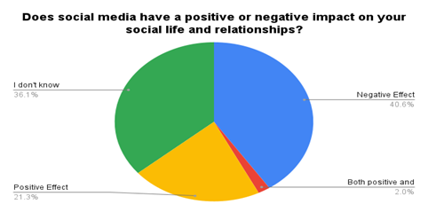 Figure 9 shows the count of responses to the question, “Does social media have a positive or negative impact on your social life and relationships?” For which, 21.3% of 202 people responded ‘Positive Effect’. 40.6% of 202 people responded with ‘Negative Effect’, 2% responded with ‘Both’, and 36.1% responded with ‘I don’t know’. The chart shows that most people believe that the use of social media has a negative impact on their social lives and relationships. Just like the prior question, this chart also shows the awareness people have about social media and its impact on their lives. ·