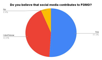 Figure 4 shows the responses to the question,”Have you ever felt left out or excluded from your social circle because of social media?” For which, 49% responded with ‘No’ and the rest, 51%, responded with ‘Yes’. This chart shows the exclusion people feel and experience in their social circles because of social media. They feel excluded because when someone- probably an individual’s friend or close family member- does something fun without them, it may feel as if they are missing out on something and feel socially excluded. ·